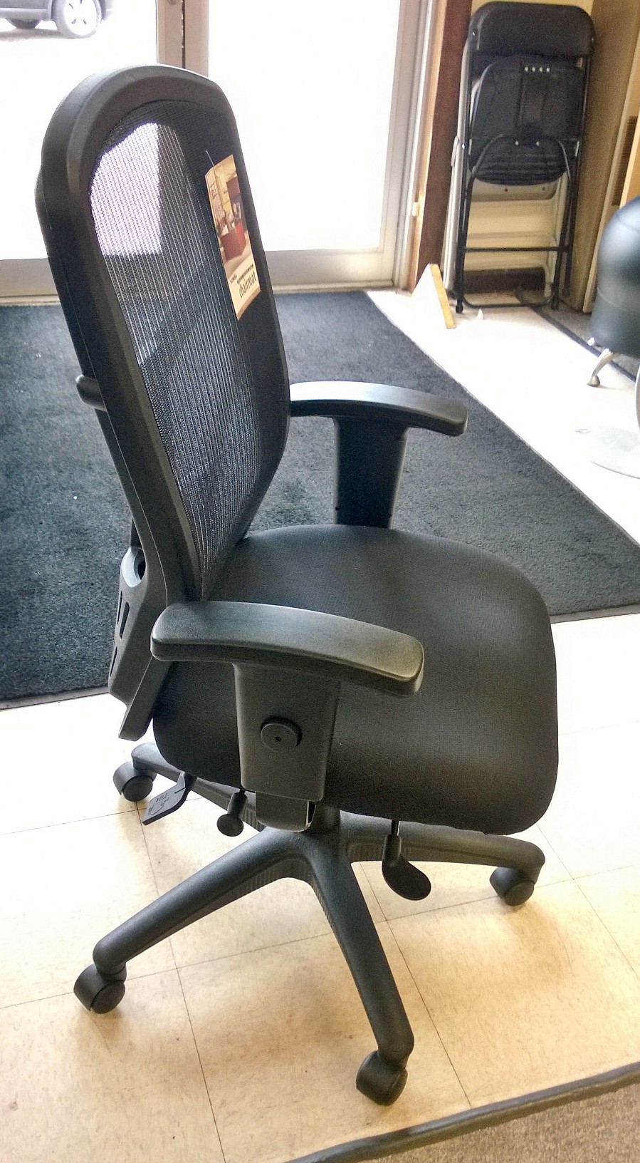 High-Back Mesh Chair offers a mesh back and seat with plastic-coated steel frame. Arms with polyurethane arm pads adjust in height and width. Functions include pneumatic seat-height adjustment, seat-glide mechanism, 360-degree swivel, tilt tension and synchronized knee tilt. High-back chair meets the CA117 fire-retardant standard.